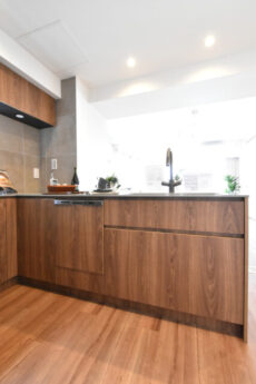 コンロの左側が冷蔵庫置場です。木目調のキッチンはまるで家具のよう。高級感がありますね