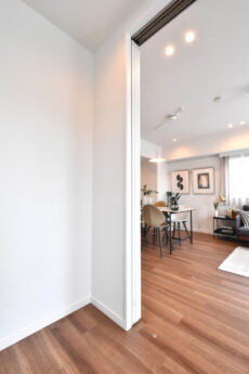 リビングダイニングとを仕切る引き戸は戸袋に扉を完全に引き込むことができるタイプです。ハンガー式なので、床にレールもありません。