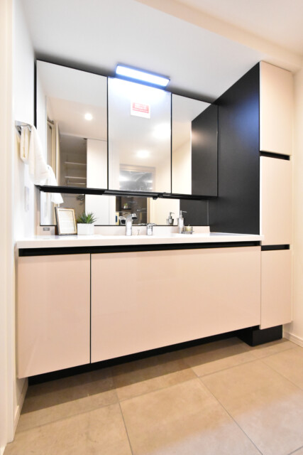 洗面化粧台はまるで宙に浮いているようなデザイン。