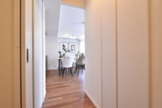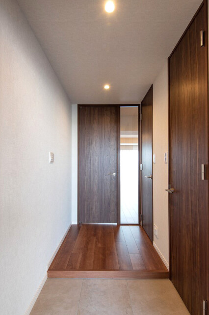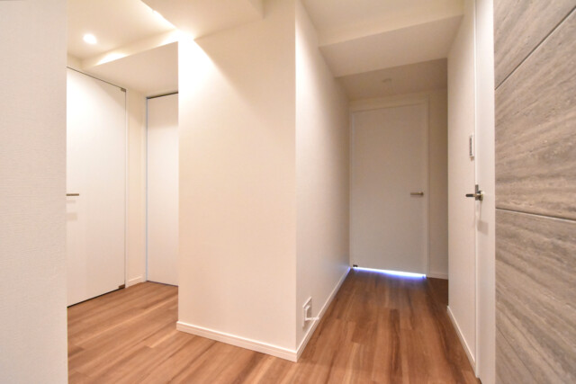玄関から続くホールはこのサイズのお部屋にしては小さめ。とはいえ、ゆったりとした幅やシックなウォールナットの色合いが高級感を感じさせます。お子様連れの時などはこの幅に感謝することになりそうですね♪