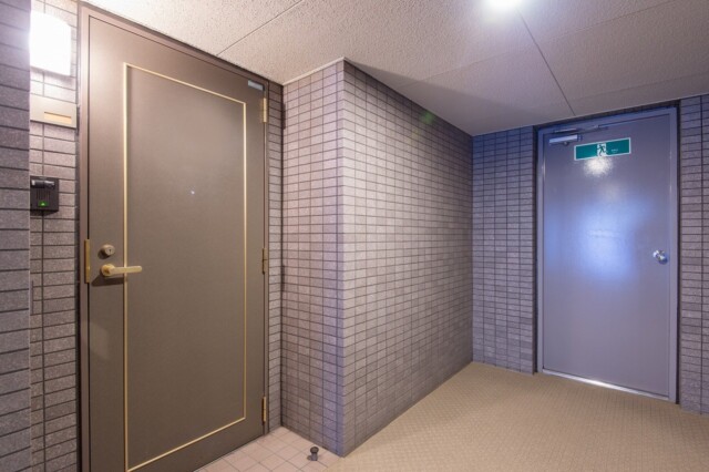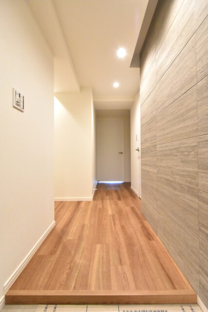 エレベーターを降りると内廊下。内廊下は悪天候も関係なく防犯やプライバシー面でも優れています。玄関前はタイル貼りで重厚感たっぷり!モニター付きインターホンが設置され、お部屋に居ながら玄関前の様子を見ることが出来ます。手が離せない時などにとても便利ですよね。