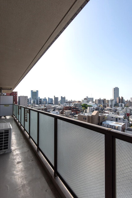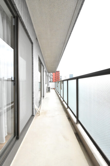 広さは7.08㎡、南向き。二部屋分の幅がある広々としたバルコニーです。サイドが開けた解放感は角部屋ならではですね。陽当たり抜群の南向き、お洗濯物もカラッと乾きそうです♬
