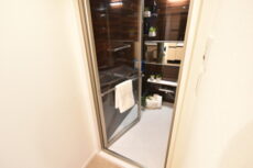 浴室のドアはガラス張り。カッコいいし高級感がありますが、入浴中に洗面室を使われるとなるとちょっと恥ずかしいかもしれません…
