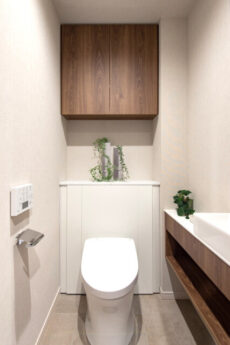 トイレの背面にはちょっとした飾りをおくことができるニッチと吊戸棚があります。