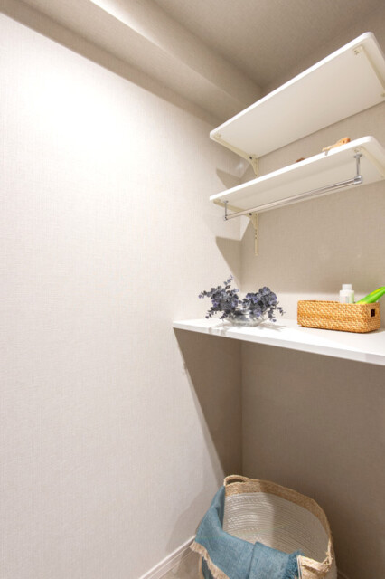 ランドリースペースの正面、使いやすい位置に可動棚が設置されています。