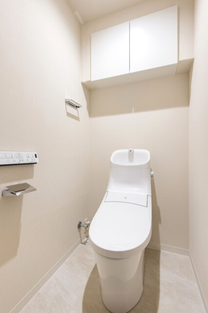 トイレはLIXIL製の洗浄機能一体型。トイレットペーパーや掃除道具を入れておける吊戸棚も付いています。