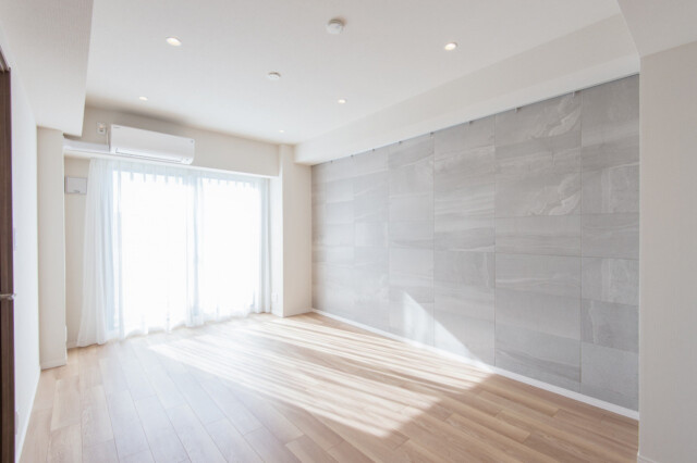 南向きバルコニーに面したお部屋です。陽当たりは最高!自然の木目を生かしたフローリングは足ざわりも良く、おもわず陽だまりでゴロゴロしたくなりそうです(笑)アクセントとして貼られたストーン調のパネルはただの飾りではありません。エコカラットといって、脱臭や湿度調節をしてくれる優れもの!まさに快適な生活を守る縁の下の力持ちですね。