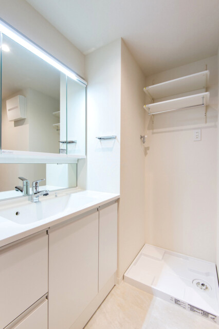 洗濯機置場は洗面室内にありながら扉付。これで入居後の洗面室内も生活感なくスッキリ保てそうです。