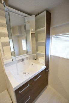 ●洗面室(シャワー付き洗面化粧台・防水バン)三面鏡で収納スペースも豊富
