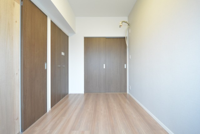 中間調のフローリングに白のクロス。濃いめの建具がアクセントになって、落ち着いた雰囲気のお部屋になっています。