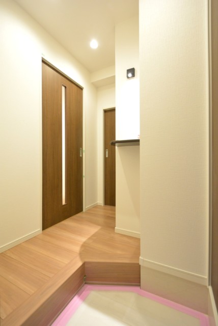 人感センサーは自動的にライトを点けてくれます。暗い中手探りでスイッチを探したり、床に荷物を置いて手を開けたりする必要ももうありません。上り口の段差は高め。最近はバリアフリーなどで段差が無い所が増えていますが、靴を履く時などにちょっと座るのに丁度いいんですよね。