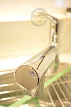 水栓は浄水機能付きシャワー水栓。簡単切替えで気軽に美味しいお水を使えます。