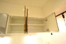 吊戸棚とニッチカウンターが付いています。吊戸棚が少し低めに付いているのが嬉しいですね。トイレが邪魔で高い所が取りづらいんですよね。