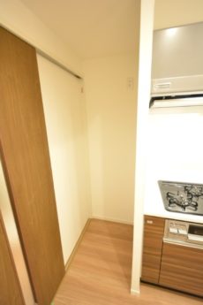 調理台右には裏が収納になったキッチンカウンター。左には冷蔵庫スペースがありました。確保されたスペースは冷蔵庫がスッキリ収まっていいのですが、サイズにはご注意下さいね。