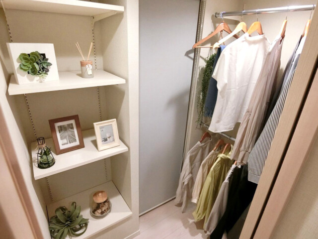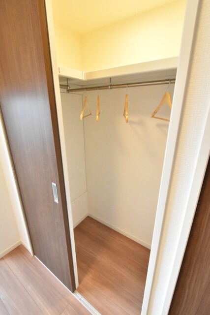 やはり収納でしたね。L字型にハンガーポールが設置されたウォークインクローゼット。約1帖ほどの広さがあり、洋服以外にもキャリーバッグなどの嵩張る物を入れておくことも出来そうです。