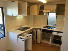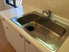 キッチンは、リビングダイニングキッチンの入口部分。キッチンの形もL字型(o´∀`ノこちらのシステムキッチンは交換されていませんが、コンロと浄水器付きの水栓は新規交換済みです。