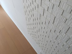 西側の壁には、石材調のタイルで装飾が施されています。