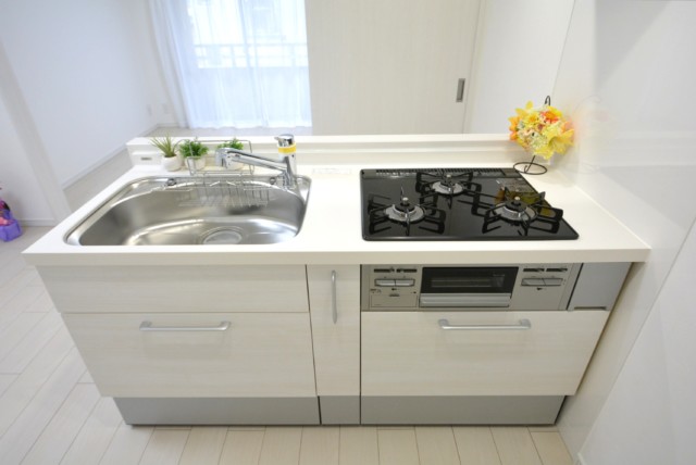コンロは三口、グリルも付いています。グリルってお掃除が大変であまり使わない方が多いと思いますが、お魚を焼く前に片栗粉を溶いた水を下に張るとお掃除が楽だったり、最近ではグリル内を汚さないグッズがあったりするらしいので、調べてみると意外にはまるかもしれませんよ(^^)