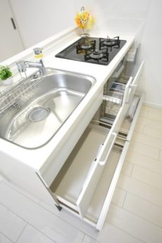 調理台下は全て引き出しタイプの収納になっていました。引き出しタイプは奥の方まで取り出しやすくて助かります。