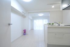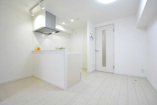 こちらは約7.8帖のダイニングキッチン+約5.5帖の洋室。洋室の仕切り戸を開けてひとつながりにした様子です。ワンルームの様な使い方になりますね。