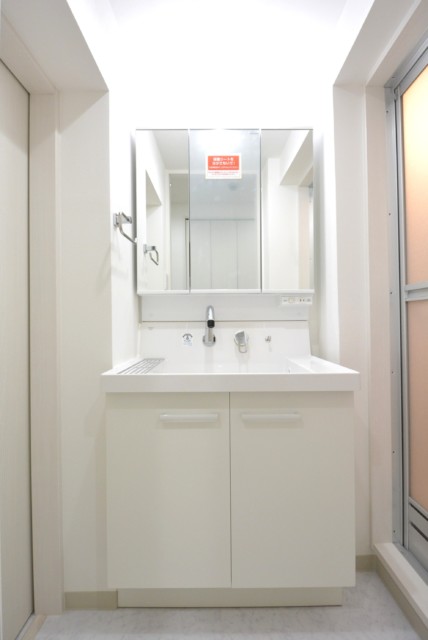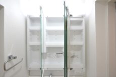まずは三面鏡付きの洗面台。白一色で清潔感がありますね。上部にはライトも付いていて、使用時に影になる事もありません。