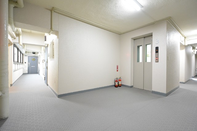 エレベーターを3階で降りると、内廊下になっていました。悪天候の日でも全く問題無し、防犯面でも優れています。