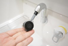 水栓はハンドシャワー水栓。ヘッドが伸びて、洗面ボウルを流したりに便利ですよ。