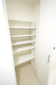 廊下左側一番手前にはトールタイプのシューズボックス。奥行きがあり、棚の手前には掃除機やハンディモップなどの背の高い物も入るようになっています。背の高い物が入る収納ってあまりないので助かりますよね。人感センサーは中に入ると自動的に照明を点けてくれます。手探りでスイッチを探す必要はもうありませんよ(^^♪