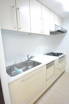 白基調の明るいシステムキッチンは3口コンロに食洗機付きとスペックも◎。