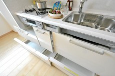 キッチン下部に引き出し収納がたくさんあるので、上部の吊り棚は食器棚としてもお使いいただけます。