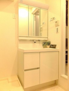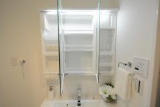 洗面化粧台は三面鏡なので、朝のメイクやヘアセットが楽になりそうです^^