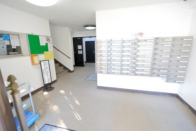 ガラス扉を開けると、目の前にはメールボックスが設置されていて、その左には管理人室が設けてあります。