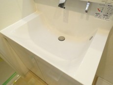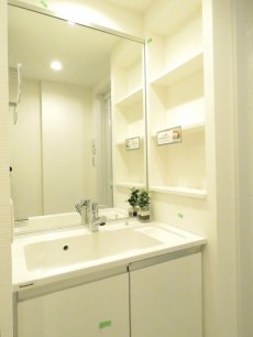 洗面化粧台は清潔感のある白。小物類は横の棚へどうぞ。