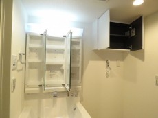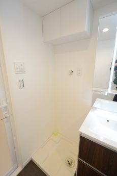 洗面化粧台と洗濯機置場はおとなり同士。鏡の裏、洗面ボウル下、洗濯機置場上と収納場所もあり、ゴチャゴチャ散らかりがちな洗面まわりのアイテムもすっきり片付けられそうです。