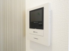 白基調の明るい玄関ホール。人感センサーがついており、人の気配で自動で照明が消灯するようになってます。消し忘れがなく経済的です。インターホンは来訪者の顔が確認できるTVモニターがついています。