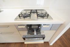 お料理がはかどる3口ガンスコンロ、浄水機能付き水栓、食洗機とキッチンはスペック◎。食事の準備も後片付けもスムーズにできそうです。