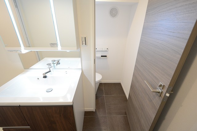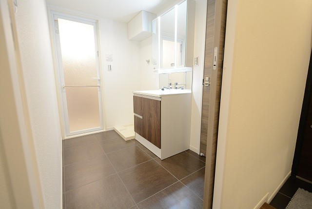 洗面室はバスルーム、洗面化粧台、洗濯機置場、トイレと水廻りの設備がまとまっておりお掃除もしやすい感じです。キッチンと近いので家事もまとめてこなしやすいですね!