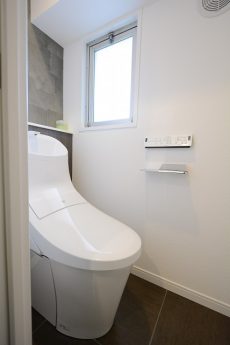 トイレはグレーのアクセントクロスが使われており落ち着いた空間になっています。(落ち着きたい場所ですよね・・・)窓があるので自然換気ができるのもポイント高いです。サニタリー用品が保管できる棚もついています。
