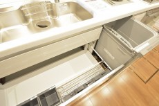 ワークトップは人造大理石、食洗機に出し入れしやすいスライド式収納と