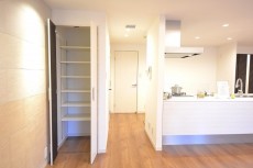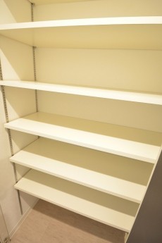 リビングダイニングには物入れ(写真左)とキッチン横にパントリー庫(写真右)