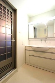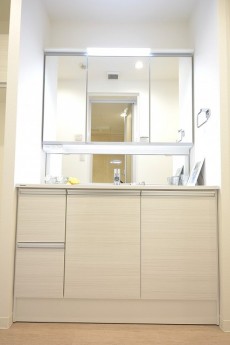 【洗面室:三面鏡付き洗面化粧台・洗濯機スペース・収納】