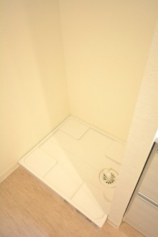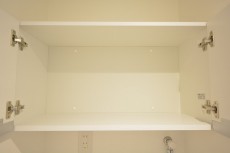 洗面化粧台の左となりは洗濯機置場。上には洗剤の置場にちょうどいい吊戸棚が