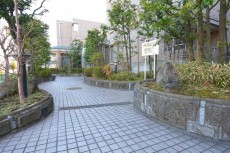 エントランス前のアプローチはタイル敷き。マンションを囲むように植栽が