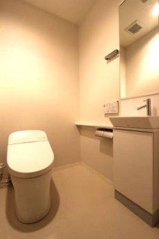 ウォシュレットと手洗いカウンター付き。カウンター下と壁面収納と