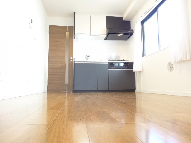 扉の奥は約6.4畳のダイニングキッチン。ナチュラルな色合いのフローリングに白いクロスのシンプル&明るい空間。シックなものからポップなものまでどんなテイストの家具を置いても馴染みそうです。