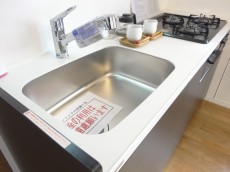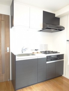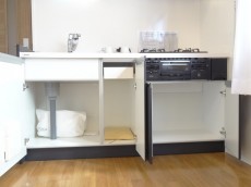 ホワイトとブラックというモノトーン配色のシステムキッチンは3口コンロ、水栓に浄水器付きとスペックも◎。キッチングッズの収納場所も上下にしっかりあります。