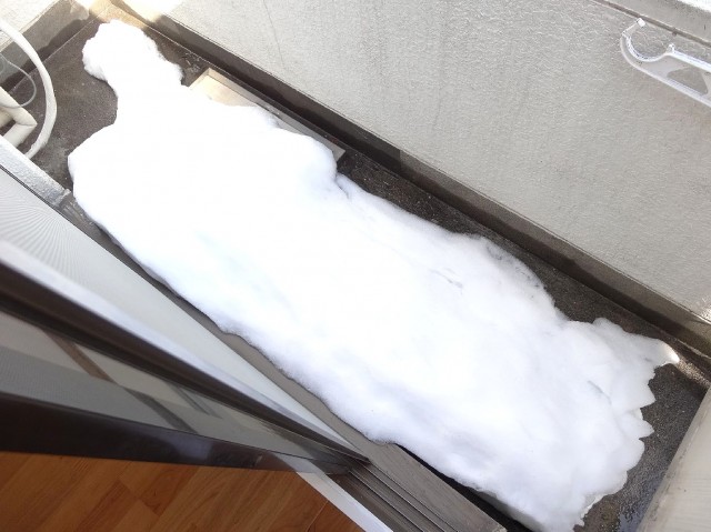 最後にバルコニーに出てみます。約2.43㎡とコンパクト。東南向き。まだ雪が残っていますね。
