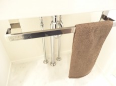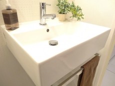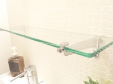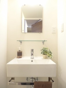 壁に鏡とガラスの棚が取り付けられた洗面台。朝の身支度もさわやかな気分でできそう。洗面ボウルの下にはタオルかけもついています。収納がない分、下に収納BOXを置いて物を入れたり・・・と自分で工夫する楽しみもありますよ。