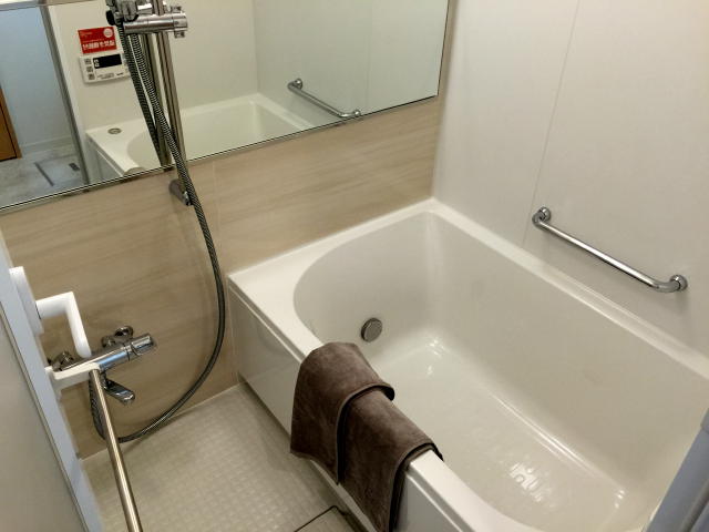 サニタリールーム入って左手にバスルーム。優しい木調パネルが落ち着ける空間のバスルームです。ゆっくり大きなバスタブにつかって疲れを癒せそうです♪♪