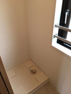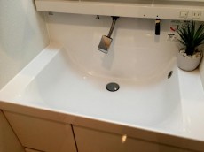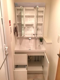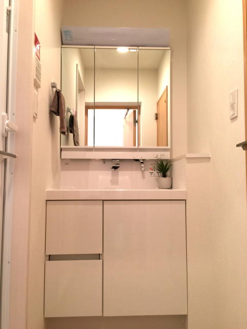 サニタリールームの正面には、白で統一された清潔感のある洗面台です。新規交換済みでピッカピカ。